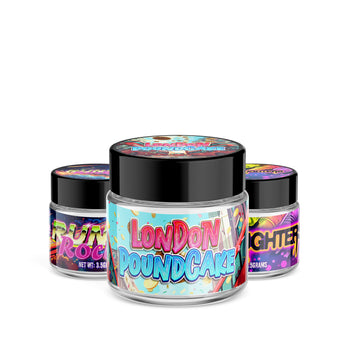 Premium Glass Curing Display Jars, in a selection of designs and strain labels, with black plastic screw-on lids.