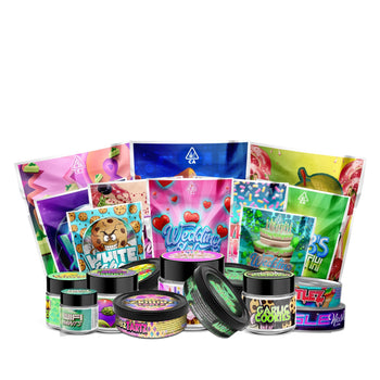 Pre-labeled Mylars, Self-Sealing Pull-Ring Tins, and Glass Jars in a variety of strain designs and sizes.